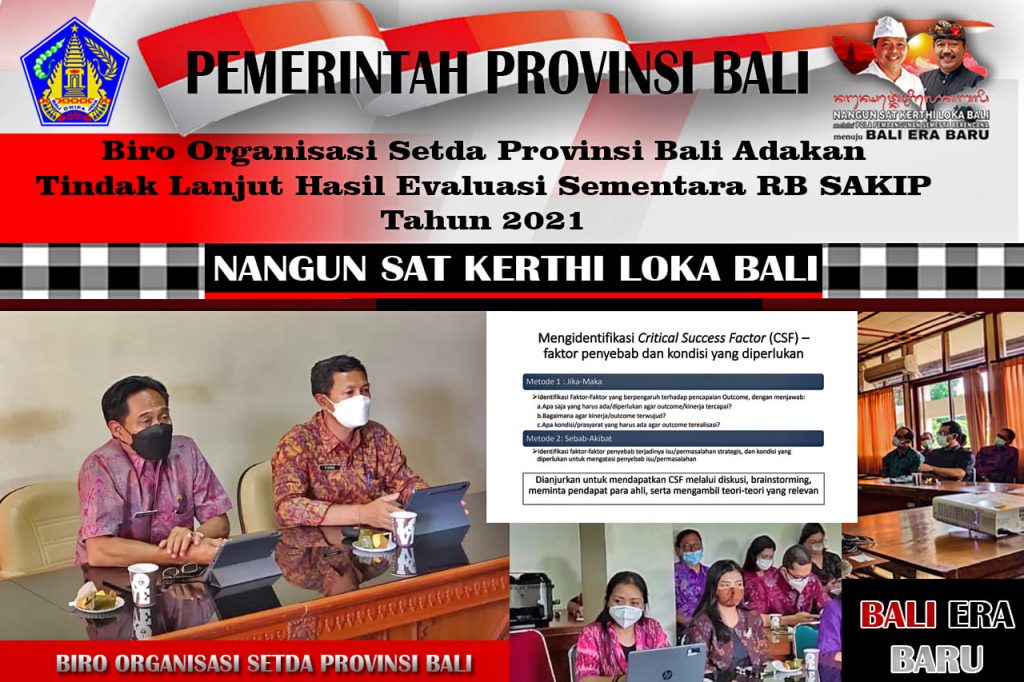 Menindaklanjuti Peraturan Presiden Nomor 81 Tahun 2010 tentang Grand Design Reformasi Birokrasi 2010-2025 dan Peraturan Presiden Nomor 29 Tahun 2014 tentang Sistem Akuntabilitas Kinerja Instansi Pemerintah (SAKIP), Biro Organisasi Setda Provinsi Bali Adakan Tindak Lanjut Hasil Evaluasi Sementara RB SAKIP Tahun 2021dengan menyampaikan Hasil Sementara Evaluasi RB SAKIP Tahun 2021 oleh Kementerian PANRB.